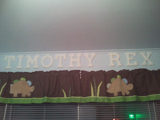 The MIL and Step-Sister In Law painted the letters and had them on the mantel at the baby shower. Now they're above the windows with the awesome stegasaurus valances and the way-more-trouble-than-they-should-have-been blinds.